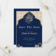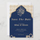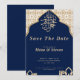 O Navy Árabe Muçulmano Oriental Dourado Save the Date apresenta um rico fundo azul-marinho com elegantes acentos dourados e intrincados desenhos árabes, perfeito para anunciar seu dia especial com um toque de elegância cultural e luxo.
