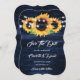 Rustic navy blue and sunflower wedding save the date card featuring sunflowers on a rustic wood background adorned with string lights. Two burlap hearts at the back. Matching items available.