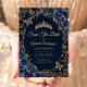 Navy Blue and gold Quinceanera celebration Save The Date card. Features, script font, butterflies, watercolor roses and tiara. Perfect for an elegant princess style glam celebration. Personalize with your own details. Printed Zazzle cards or instant download digital printable template.