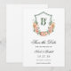 Este lindo cartão de "Save the Date" de casamento com o brasão floral em tons de pêssego e as iniciais dos noivos seria perfeito para o seu casamento. A sua redação é tradicional, mas moderna, e as fontes são requintadas. As peônias cor de rosa, rosas, flores silvestres, lírios do vale e folhagens delicadas são românticas e elegantes.