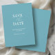 Anuncie seu grande dia com estilo com esses elegantes save the dates! Projetado para casais que procuram um convite de casamento save the date moderno e sem foto, este cartão apresenta um fundo azul-turquesa ousado com uma mistura sofisticada de tipografia clássica e cursiva em branco crocante.
