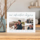 Um moderno e excitante cartão de data para o casal de espírito aventura, este design simples e limpo apresenta três fotos horizontais ou orientadas à paisagem em um layout de colagem em grade, com "nossa aventura começa" acima em um roteiro escrito à mão. Personalize com seu anúncio, nomes e detalhes adicionais na parte inferior e adicione mais (como seu site de casamento) na parte de trás.