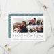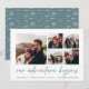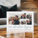 Um moderno e empolgante cartão de data para o casal de espírito aventura, este design simples e limpo apresenta cinco fotos quadradas em um layout de colagem em grade, com "nossa aventura começa" acima em um guião empoeirado à mão. Personalize com seu anúncio, nomes e detalhes adicionais na parte inferior e adicione mais (como seu site de casamento) na parte de trás.