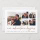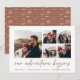 Um moderno e empolgante cartão de data para o casal de espírito aventura, este design simples e limpo apresenta cinco fotos quadradas em um layout de colagem em grade, com "nossa aventura começa" acima em um guião com letras de mão à direita em terracota terrestre. Personalize com seu anúncio, nomes e detalhes adicionais na parte inferior e adicione mais (como seu site de casamento) na parte de trás.