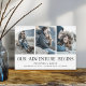 Um rústico salva o cartão com fotos de data para o casal externo e aventureiro, projetado para acomodar três de suas fotos de noivado favoritas alinhadas lado a lado. "Nossa Aventura Começa" aparece em preto no fundo, com seus nomes, data do casamento e local do casamento embaixo. Cartões que se revertem a um padrão de minúsculos pinheiros desenhados à mão sobre um fundo enfumaçado de cinza azul.