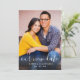 Anuncie sua mudança de casamento em estilo com os cartões modernos de anúncio "Nossa Nova Data" que apresentam sua foto de noivado com um belo roteiro "salve nossa data" design de sobreposição que é elegante, mas brincalhão. Inclui a redação na parte traseira do cartão que pode ser personalizada com todos os detalhes importantes.