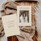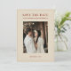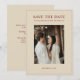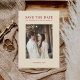 Este chique anúncio de Save the Date apresenta uma sensação moderna de livro de receitas. A frente minimalista tem uma foto, texto serifado clássico e um fundo bege cremoso. A parte traseira do anúncio tem espaço para uma mensagem formal de save the date.