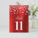 Números elegantes da mesa de casamento com uma caligrafia de roteiro de rico combinada com uma fonte moderna de bonés. A imagem gráfica de fundo apresenta a folha vermelha de satin ombre e os diamantes prateados de rhinestone confetti ao longo do topo. Qualquer brilho é uma criação digital. O texto do número da tabela é duplicado em frente e atrás, mas você pode personalizar um lado se preferir uma lista de nomes de convidados. Isto não é um conjunto. Eles precisam ser personalizados individualmente para o número exato de mesas que você precisa.