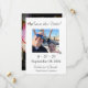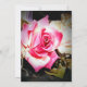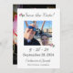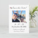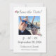 A frente de design apresenta sua foto logo abaixo do título, "Save the Date!" em uma elegante fonte de cor prateada. Imagem de dois rosas entrelaçados é fotografada ao lado do cabeçalho. A mesma imagem é exibida no canto inferior direito da foto. A data do casamento é claramente mostrada abaixo em dois estilos diferentes. Cidade e estado do casamento aparecem em texto menor na parte inferior da design. Design traseiro apresenta uma imagem de fundo de uma rosa rosa rosa no cheio florado. Projetado para coordenar com o "Love is in Bloom Wedding Suite."