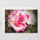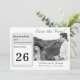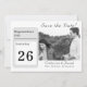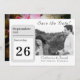 Design apresenta a imagem de um calendário diário mostrando claramente sua data de casamento. À direita, sua foto é apresentada logo abaixo do título, "Salvar a data!" em uma elegante fonte de cor prateada. Os nomes dos casais são exibidos abaixo da foto no mesmo script que o cabeçalho. Cidade e estado do casamento aparecem em texto menor abaixo dos nomes. Design traseiro apresenta uma imagem de fundo de uma rosa rosa rosa no cheio florado. Projetado para coordenar com o "Love is in Bloom Wedding Suite."