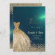Vestido de ouro elegante e diamantes confete em fundo verde. Um convite bonito que pode ser personalizado com seu nome. Selecione o botão "personalizar" para alterar o estilo, a cor e o tamanho da fonte.