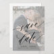 O romântico elegante roteiro de caligrafia com letra chic, preto e branco, salve o modelo com sua foto personalizada e a cobertura branca transparente. ++++++++++ Fácil de personalizar com seus detalhes e imagem de noivado em ambos os lados! +++++++++ Adequado para qualquer casamento clássico elegante de estação.