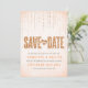 Este lindo design de anúncio de salvar a data pela The Spotted Olive™ apresenta um lindo fundo de cor laranja-peach suave com uma imagem de gemas cintilantes e as palavras "Save The Date" tipograficamente estilizadas e preenchidas com uma imagem de brilho laranja-peach. POR FAVOR, NOTE: ESTE DESIGN APRESENTA APENAS UMA IMAGEM IMPRESSA DE BRILHO; NÃO HÁ BRILHO FÍSICO USADO OU INCLUSO; NÃO HÁ EMBELEZAMENTOS. ESTE É UM CONVITE IMPRESSO PLANO. Copyright 2013-Atual | The Spotted Olive™ | Todos os Direitos Reservados