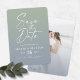 Ombre Dusty Blue & Green com Casamento de Fotografias de Script Salve As Cartões de Data. Este design moderno, porém clássico, é minimalista e elegante com um bonito gradiente ombre e belo texto de assinatura de caligrafia. Mostrada na nova via colorida. Também apresenta uma fotografia personalizada opcional do casal no verso. Ou simplesmente ocultar a camada para ter um fundo sólido. Para ver mais, procure as coleções de casamento de 2022 da Chic Paperie para ver todas as tendências de designs e cores de casamento para este ano.
