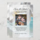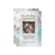 Um design refrescante e sofisticado apresenta uma cena da costa do oceano azul aqua-teal com ondas brancas quebrando na costa. Água azul clara e fresca e areia branca com céu azul e nuvens brancas fofas. Em primeiro plano, uma bela flor de orquídea branca em close-up de alta qualidade. Esta imagem zen serena e tranquila é perfeita para um casamento na praia, ou evento especial ou ocasião de negócios com tema de viagem de resort de spa. Relaxe enquanto recebe uma massagem, manicure ou pedicure no salão. Desfrute do relaxamento e da tranquilidade à beira da praia e do oceano. Todos os Designs Copyright © 2012 www.CustomInvitesOnline.com