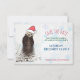 O Natal salve o cartão de encontro com uma fotografia natural de uma lontra fofa que se levanta na água com as patas debaixo do rosto. Vestindo um chapéu de natal vermelho desenhado à mão. Um padrão de fundo em floco de neve atrás do texto.