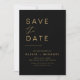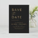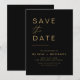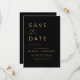 Cartões de Salve a Data de casamento elegantes preto e dourado. Os cartões de Salve a Data contêm uma tipografia de roteiro cursivo manuscrito moderno que é elegante, simples e moderno para usar após a celebração do seu casamento minimalista simples.
