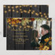 O casamento outono elegante do outono chic salve o cartão modelo na madeira marrom-escura apresentando belos buquês botânicos laranja arruinados com folhas e folhagem secas, cordas ou luzes cintilantes, e um roteiro de caligrafia em ouro. ++++++++++++++ Fácil de personalizar com seus detalhes e duas fotos na frente e atrás! ++++++++++ Adequado para o final elegante do verão ou outono, casamentos de quintais ou casamentos de celeiro no exterior.