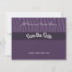 Um design moderno com tons de roxo com um padrão de stripe de zebra ao longo do topo. Personalize esta opção Salvar a data com suas informações.