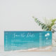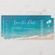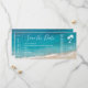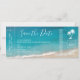 Casamento de Destino de Praia Salve o Cartão de Datas que Parece um Bilhete de Avião Embaralhando Passagem apresenta um oceano tropical azul profundo e turquesa e praia de areia macia com ondas caindo para a costa, e fontes modernas casuais e divertidas em um design simples. Há espaço na parte de trás para viagem e detalhes de acomodações opcionais para que seus hóspedes se ocupem reservando a viagem.