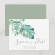 Anuncie seu noivado com meu tropical, salve os convites de data com a opção Salvar nossa data em um estilo de tipografia de script de tendência que evoca o aspecto da letra da mão. Esta simples carta mostra a minha cor d'água original de folha de palma de monstera com seus nomes, data de casamento e local do casamento. Cartões invertem a cor verde de sábio sólido complementar. Perfeito para Chaves tropicais da Flórida, Caribe, Havaí e casamentos de destino. Para ver a suíte de casamento correspondente, visite DotellABelle no Zazzle.