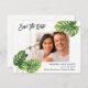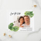 Esta moderna placa Save the Date apresenta folhas de palma tropicais nos lados opostos da placa e uma imagem do casal no centro. A parte de trás do cartão inclui uma fotografia mais pequena e detalhes adicionais do casamento. Essa carta elegante é perfeita para um Primavera ou Casamento de Verão, ou para um Casamento com tema tropical.