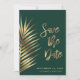 Elegante salve o cartão de anúncio com palma tropical de ouro e folhas de samambaia contra um fundo verde escuro, "Salve a Data" em um grande roteiro de na moda e seus nomes e salve os detalhes da data em uma tipografia moderna mínima. Perfeito para um casamento.