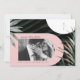 Arcos cor-de-rosa e brancos esfregados sobre o fundo da folha de palma escura com monograma vertical no topo direito e folhas de palma com aquarela no canto superior esquerdo e inferior direito. Personalize o texto branco e a foto.