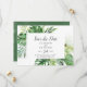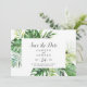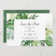 Esta palma tropical selvagem salva o cartão de data é perfeito para um casamento de praia ou destino. A design apresenta um conjunto exótico de folhas de palmeiras de banana-d'água verde, samambaias, folhagem, plantas botânicas e verde para uma sensação tropical de verão.