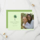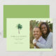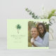 Este convite de casamento apresenta um layout dividido com um fundo verde claro de um lado, apresentando uma ilustração detalhada de uma palmeira. O outro lado inclui um espaço reservado para uma foto com foco suave e quente de dois indivíduos se abraçando, sugerindo um momento íntimo. O design emprega fontes serifadas clássicas para um toque refinado e usa uma paleta de cores suaves para criar um tema tropical e elegante. Perfeito para transmitir calor e alegria, este modelo é ideal para casais que celebram sua união em um ambiente sereno.