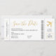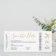DOURADO DESTINO WEDDING BOARDING PASS SALVAR O CARTÃO DE DATA na forma de um bilhete de avião com uma estética retrógrada dos anos 90 apresenta um logotipo elegante de casamento de avião com detalhes autênticos como setas e um código de bar e uma letra moderna de escrita de caligrafia. Todos os detalhes são editáveis para que você possa usar este modelo para qualquer ocasião, evento ou celebração como um retiro corporativo, festa de noivado, chá de panela, mitzvah ou festa de aniversário. Visite a Loja Zazzle Destinos de Uvas de Papel para toneladas de peças de correspondência e coordenação para construir o seu pacote de convites para temas de viagem e o decor de artigos de papelaria.