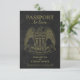 Estes casamentos bonitos, exceto os cartões de data, são feitos para se parecerem com um passaporte com um fundo preto de couro, uma águia americana e impressão de ouro. As costas se assemelham à dentro do passaporte com uma foto e carimbos bonitos de entrada que listam seu destino de casamento. Excelente maneira de deixar seus amigos e família saberem manter a data aberta para viajar ao seu casamento.