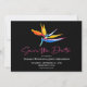 Esta elegante e moderna salvação tropical apresenta uma vibrante ave floral de cor d'água do paraíso e uma tenda escrita à mão rosa num fundo negro escuro. Isto é perfeito para o casal ter um casamento na praia ou outro casamento de destino tropical.
