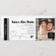Passagem moderna para o casamento de passagem de embarque com um simples fundo branco que pode ser mudado para qualquer cor, uma foto do casal noivo, um avião com trilha de circuito cardíaco e um modelo de data personalizado que é fácil de personalizar.