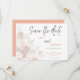 Bonito florais pastéis em tons de cor-de-rosa-pincel, pêssego e cinza mole decoram o canto inferior esquerdo. Salvar A data está em um script de conjunto de na moda como o é "e". O resto do texto numa mistura de preto, cinza e coral pode ser facilmente personalizado. Uma sombra de coral coordenadora está na parte de trás que pode ser alterada para outra cor se você desejar por meio de Personalizar mais.