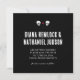 Dois crânios compartilham o olhar do amor neste salvar a data de casamento preto. Se você é uma bruxa, mago, pirata, gótico ou apenas uma pessoa da noite e não tem medo do escuro, este convite é para você. Fontes texturizadas e um layout simples e limpo tornam os nomes do casal o foco e o texto fácil de editar direciona os convidados a um site para mais informações sobre o casamento e eventos relevantes.