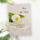Defina o tom para os vossos núpcias de março, abril ou maio de primavera inspo com a elegante Tulpa Branca, Pérolas e Anéis de Casamento Salve o Anúncio de Data. Este elegante casamento de flores personalizado mantém o anúncio da data com uma fotografia floral de um colar branco de cor de tulipa, anel de noivado de diamante e conjunto de bandas de casamento com um lenço de linho de vintage. Disponível como um convite impresso para envio por correio ou como um download digital para fácil compartilhamento digital online.