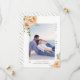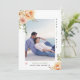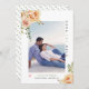 As flores de pêssego de coral são verdes. Salve o anúncio da foto de Data. Uma design adorável que mostra uma foto, flores de pêssego nos cantos superior esquerdo e inferior direito, o texto "Salvar a Data" em preto e verde sábio e um coração cor-de-rosa pincelado. O verso inclui um padrão de bolinhas em verde-sábio e branco.