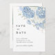 A timeless Dusty Blue & White floral photo save the date featuring soft watercolor hydrangea artwork on the front and a full-photo back layout for your engagement or couple photo.