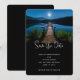 Cartão de salvar a data com uma bela fotografia de um píer de madeira que se estende sobre um lago calmo. Céu noturno coberto de estrelas e uma bela lua cheia.