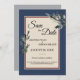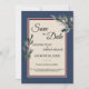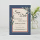 Este Casamento no inverno Pine Blue salve a data combina uma fronteira azul elegante e empoeirada com elegantes, pinheiros verdes comprados para um olhar clássico, mas rústico. A folhagem botânica verde com tipo caligrafia sobre fundo bege cria uma víbora focada na natureza para a celebração do casamento de Natal ou de destino florestal.