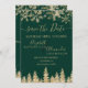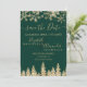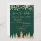 Hora de comemorar seu tema de casamento da Maravilha de inverno com este luxo flocos de neve amarelo-brilho faíscas e floresta de pinheiros com brilho dourado em um elegante fundo verde-escuro festivo, com uma tipografia moderna de fontes legal. Um casamento chic e elegante salve o cartão.