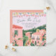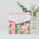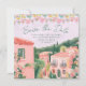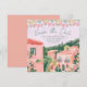 This destination wedding Save the date features painted artwork of a Mexican town scene with papel picado banners on top. All the important wedding details can be personalized. Colors include green, pink, white and coral.