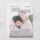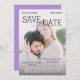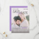 Salve o cartão de data exclusivo inspirado em um típico design de poster de filme com título, seus nomes, citações de críticos, sua foto personalizada e muito mais com um sotaque roxo.