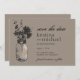 Perfeito para um casamento estilo country ou talvez você simplesmente adore potes de Mason! Velho pote de Mason vintage pendurado em um gancho com flores silvestres country. Um maravilhoso tom de fundo marrom quente com desenho preto de um pote de Mason cheio de flores silvestres country. Se você tiver alguma dúvida sobre este design ou quiser uma mudança de cor, por favor me envie um email paula@labellarue.com. Confira também os CONVITES DE CASAMENTO, RSVP, RECEPÇÃO e CARTÕES DE ASSENTAMENTO DE CONVIDADOS para combinar!
