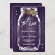 Cartão de aviso de casamento roxo rústico com um pote de pedra e corações de aniagem contra um fundo de madeira de celeiro adornado com luzes cintilantes. Personalize facilmente este adorável aviso de casamento roxo rústico online. Itens correspondentes disponíveis para complementar este aviso de casamento roxo.