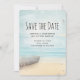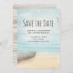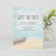 Salve o cartão de data com uma bela e tranquila imagem. Cores sutis de azul claro, marrom arenoso e branco suave. Uma cena de praia com um barco na praia e um farol desbotado à distância com pássaros voando ao redor. Um olhar elegante.