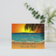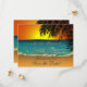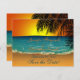 Uma design romântica de praia tropical apresentando uma ilustração de uma cena de praia no Sunset com uma silhueta de folhas de palma em primeiro plano. O design é apresentado em ambos os lados do anúncio para salvar a data. O texto na frente é totalmente personalizável para salvar a placa de data simples para sua próxima ocasião especial. Isto coordena-se com a praia Tropical na Coleção de Casamentos Sunset. Se você precisar de assistência para a personalização do seu dia especial ou gostaria que isso acontecesse em produtos que não estão disponíveis no momento com este design, entre em contato conosco através da nossa loja WeddingBazaar.