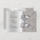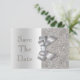 Cartões personalizados de Save The Date para casamento. Elegantes cartões de notas formais prateados, duplos e planos, com um lindo padrão de lantejoulas brilhantes impressas, laços e fitas com imagem vetorial prateada brilhante e diamantes, joias bling com imagem estilosa e texto cinza prateado escuro em um fundo gradiente prateado. Esses cartões de notas formais prateados, glamorosos e fashion são decorados em ambos os lados e impressos no papel de convite de sua escolha. Belos, elegantes, modernos e sofisticados cartões duplos com brilho e glamour femininos. Por favor, note: Todos os convites no Zazzle têm imagens impressas planas. Tenho produtos combinando para casamentos na minha loja. O texto, a fonte e as cores da fonte são todos personalizáveis para atender às suas necessidades. Se precisar de ajuda para personalizar seu produto, entre em contato comigo através da minha loja.