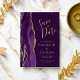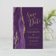 A borda esquerda deste elegante casamento moderno salve o cartão de data apresenta uma borda de agata púrpura aparada com falso brilho dourado. O texto personalizável combina manuscrito dourado, fontes em copperplate e itálico em um fundo rico em ameixa. O verso apresenta um design de agate roxo e dourado correspondente.